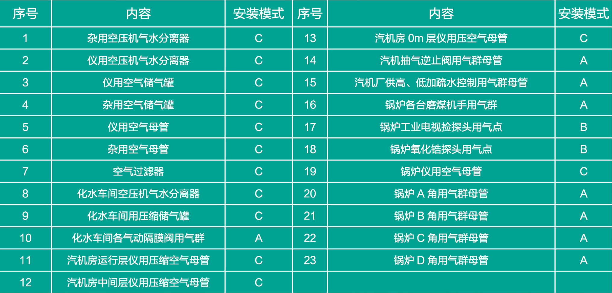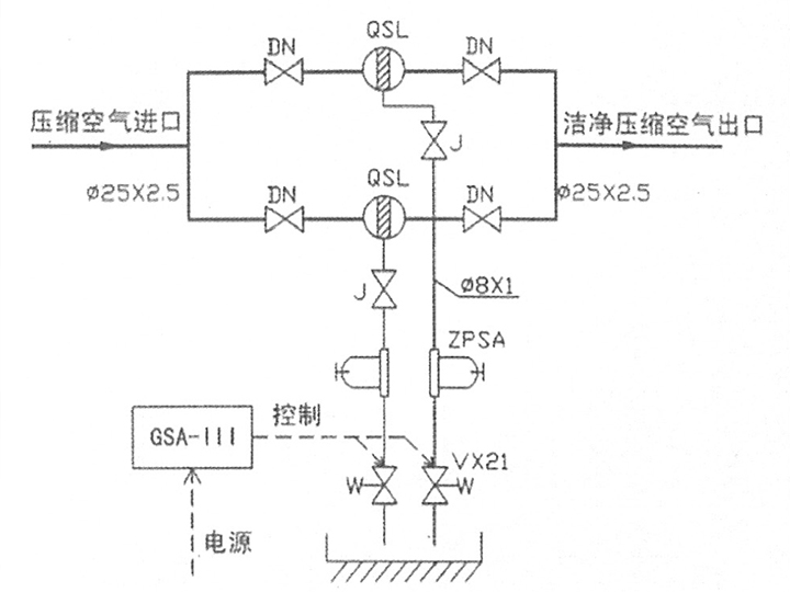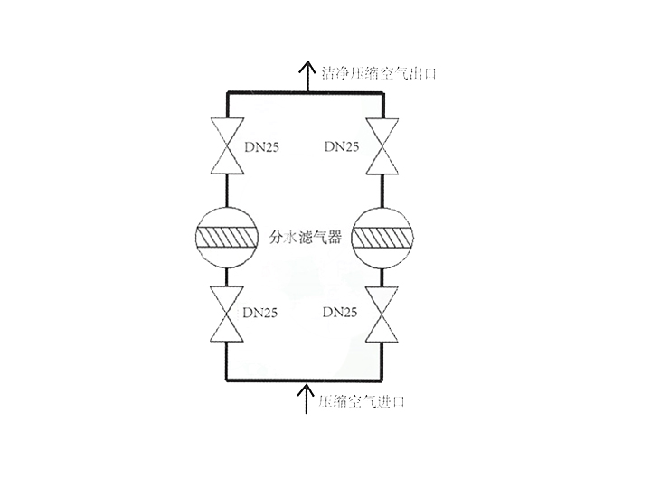 1、壓縮空氣凈化裝置進出口接管一律用由Φ32*2.5。 2、各用氣點接管一律用由Φ14*1。 3、所有設(shè)備裝置選用GSA-111-2-DN25。 4、凈化模式一般采用A模式,也可以按設(shè)計圖采用其他模式。 |